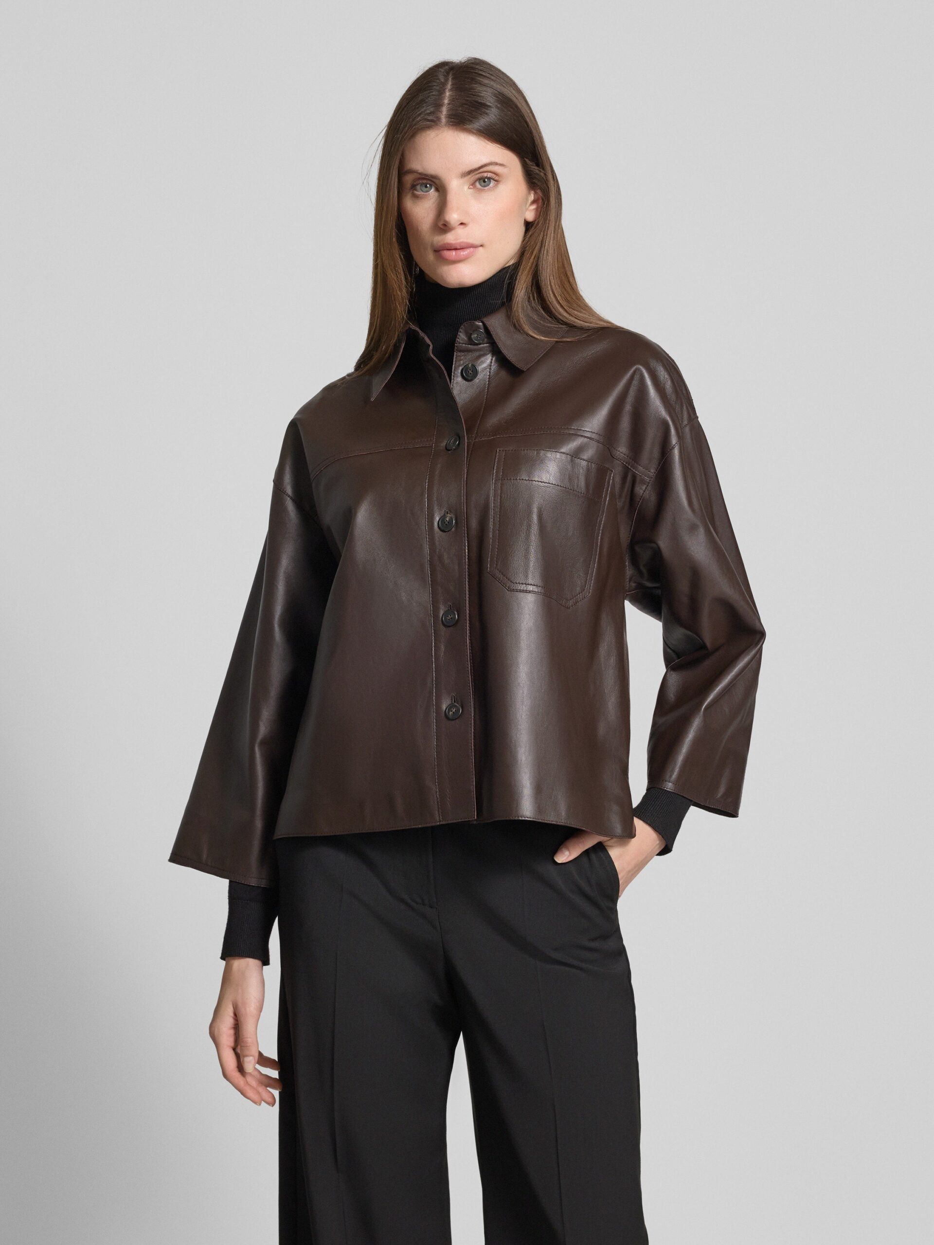 Opgrader din garderobe med den luksuriøse ‘STECCA’ læderjakke fra Weekend Max Mara. Fremstillet i 100% lammeskind og designet i en moderne boxy fit, kombinerer denne jakke eksklusiv kvalitet med tidløs stil. Den elegante krave og 3/4-ærmerne giver